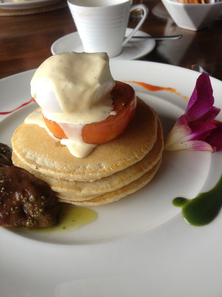 Owing to the rain, we had an extra long breakfast here at Gayana Eco Resort. Paul selected a sea bass hash with poached egg from the a la carte menu today, while I decided that I had best sample the savory pancakes.